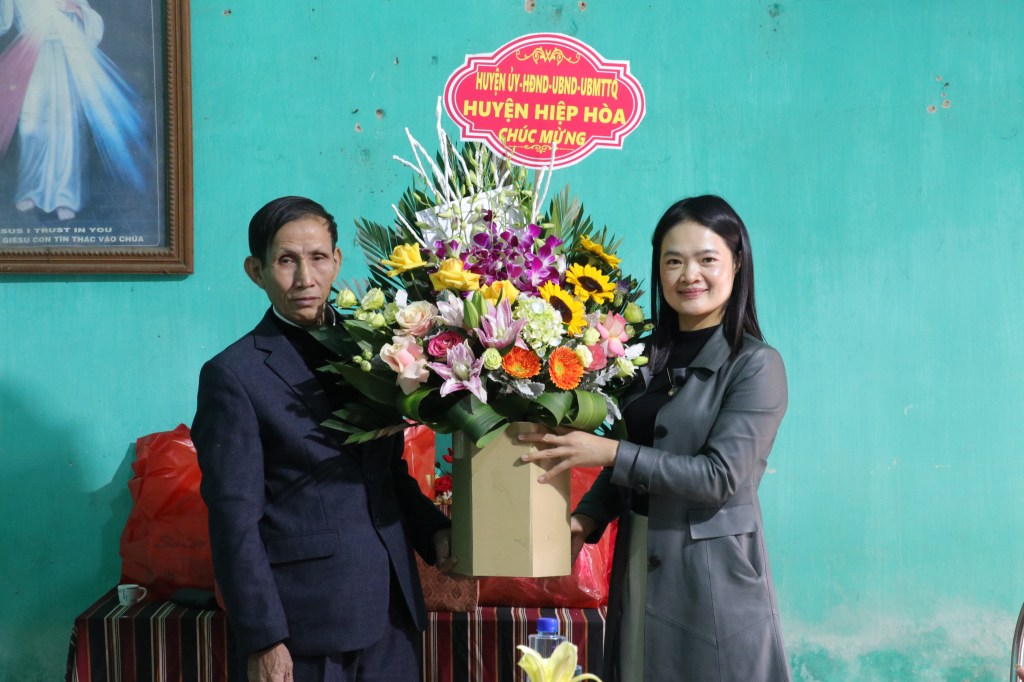 Nhân dịp này, thay mặt Huyện ủy – HĐND – UBND – Ủy ban MTTQ huyện, đồng chí Hoàng Thị Phương đã tặng lẵng hoa, quà cho các hộ giáo dân có hoàn cảnh đặc biệt khó khăn và chúc bà con Giáo dân hưởng mùa Giáng sinh an lành, hạnh phúc.