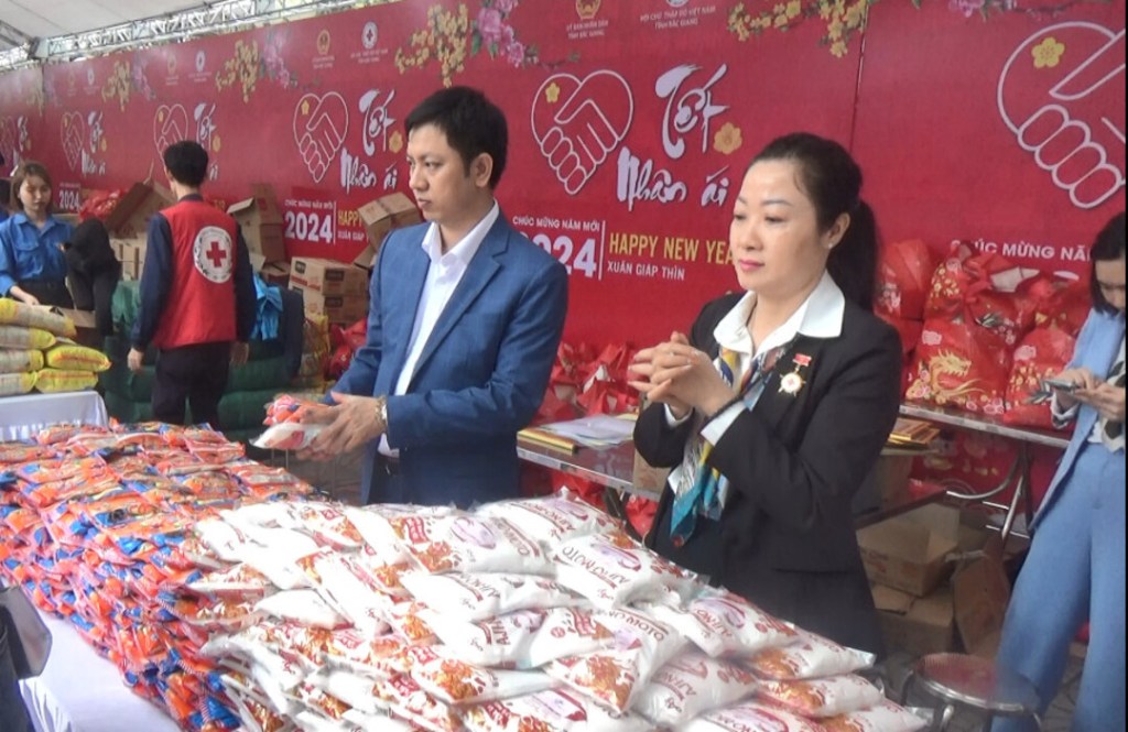 Tại chợ Tết nhân ái, Ông Hoàng Văn Hưng và bà Trần Thị Thùy Linh- Ban lãnh đạo Công ty cổ phần đầu tư Lâm Phong Group Hà Nội đã phát 500 suất quà trị giá hơn 37 triệu đồng cho người nghèo, người có hoàn cảnh khó khăn của Hiệp Hòa, bao gồm bột canh và mì chính.