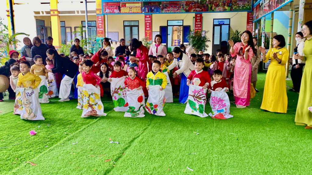 Rất sôi động, vui tươi và rèn luyện sức khỏe, tính nhanh nhẹn, thông minh cho trẻ được tổ chức qua các trò chơi vô cùng thú vị sau khi phần đầu kết thúc. Trong tiếng trống ầm vang, tiếng reo hò cổ vũ, những lời động viên của mọi người, trẻ vô cùng hào hứng với các trò chơi dân gian trong ngày tết. Cùng với sự giúp đỡ của cô giáo, cha mẹ, trẻ thỏa sức với các trò chơi như kéo co, nhảy bao bố, bịt, bịt mắt đánh trống. Trò chơi rất vui với trẻ, rèn luyện ý chí và tôn vinh sức mạnh tập thể, tinh thần đoàn kết của các đội chơi. Qua đây, giúp trẻ sẽ phát triển khả năng tư duy, sáng tạo và gắn kết tình cảm bạn bè, tình yêu gia đình, tình quê hương, đất nước… Những trò chơi dân gian trong ngày tết mang âm điệu thực sự vui tươi, sống động nhí nhảnh, thực sự gần gũi với cuộc sống còn giúp trẻ thêm hào hứng học tập và sống hồn nhiên hơn, góp phần xây dựng trường học thân thiện, trẻ em tích cực, là nguồn lực quan trọng xây dựng trường mầm non hạnh phúc. Đây chính là điều quan trọng cần tổ chức nhiều trò chơi trong các hoạt động hàng ngày ở trường học cho trẻ mầm non