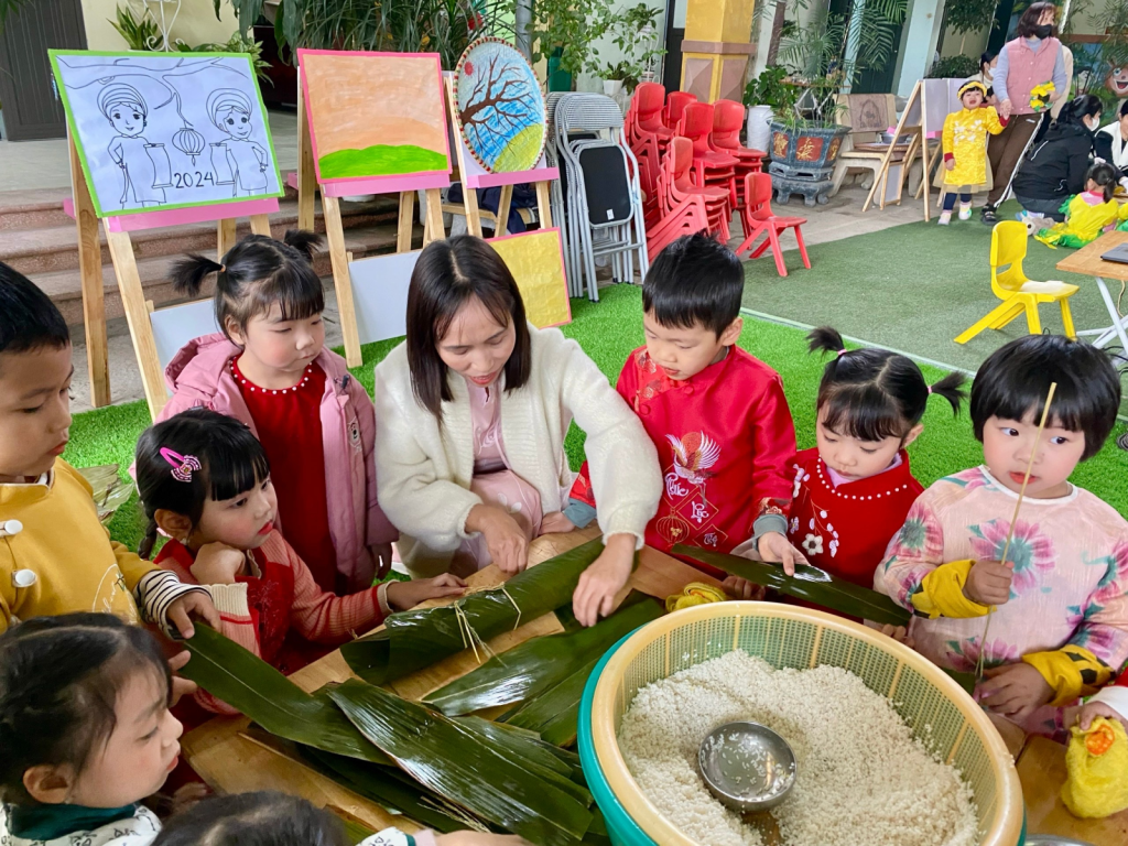 Không khí tết tràn ngập xen giữa tiết trời hơi se lạnh, trẻ được thỏa sức với nhiều hoạt động để phát triển năng lực cá nhân. Để hiểu về bánh chưng, bánh dầy ngày tết trong mỗi gia đình, đầu tiên trẻ được nghe cô giáo giới thiệu về cây lúa nếp cái hoa vàng trên quê hương mình. Từ bàn tay lao động của ông bà, cha mẹ đã làm ra hạt gạo trắng ngần, dẻo thơm, nuôi sống con người. Giống lúa đã sinh sôi này nở trên mảnh đất Bắc Lý gần 40 năm qua và đã trở thành thương hiệu sản phẩm nông nghiệp trên thị trường Bắc Giang nói riêng và cả nước nói chung, mang lại giá trị kinh tế cao cho người nông dân. Qua đây, trẻ em được chia sẻ để ghi nhớ về công ơn của những người làm ra hạt gạo, đồng thời hiểu kỹ về giá trị hạt gạo nếp cái hoa vàng trên quê hương mình.