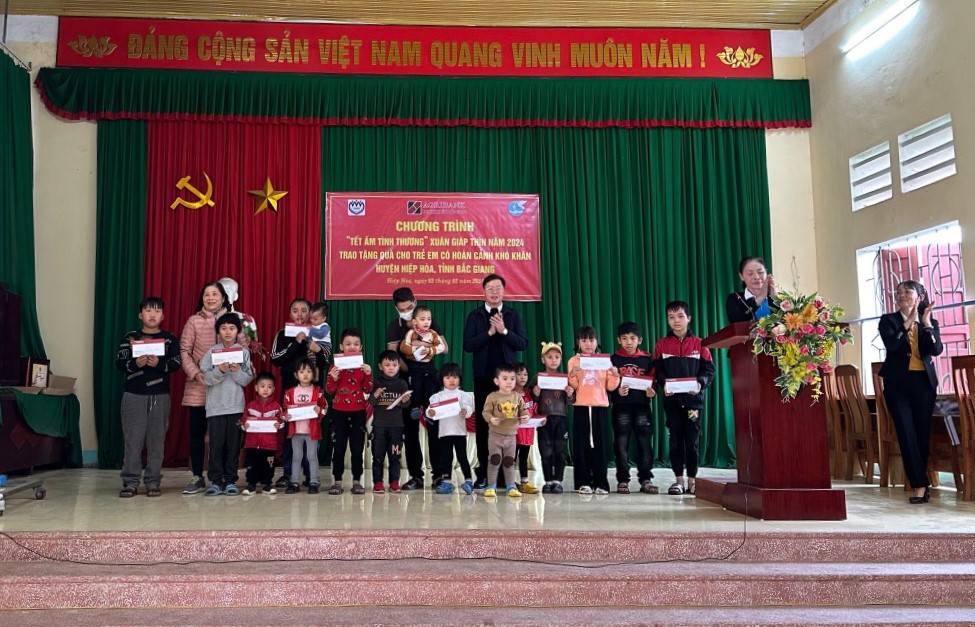 Đi cùng với các hoạt động của hội Bảo vệ quyền trẻ em huyện Hiệp Hòa, Ngân hàng Agribank chi nhánh tỉnh Bắc Giang luôn tích cực thực hiện công tác từ thiện, nhân đạo nhằm phát huy tinh thần tương thân tương ái, chung tay vì người nghèo, đặc biệt là trẻ em, người có hoàn cảnh khó khăn, người yếu thế trong xã hội, với mục đich không để ai bị bỏ lại phía sau. Với sự kết nối của hội Bảo vệ quyền trẻ em tỉnh Bắc Giang và hội Bảo vệ quyền trẻ em huyện Hiệp hòa ngày 02/02/2024 tại xã UBND Ngọc Sơn Agribank chi nhánh tỉnh Bắc Giang đã trao 30 suất quà cho trẻ em có hoàn cảnh khó khăn mỗi suất 600.000đồng. Tổng số tiền là 18.000.000 đồng (Mười tám triệu đồng chẵn)