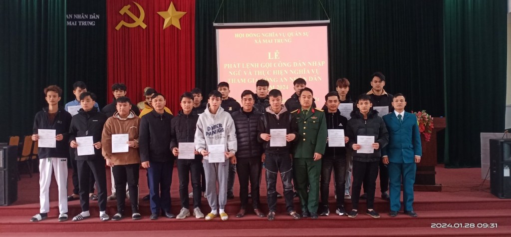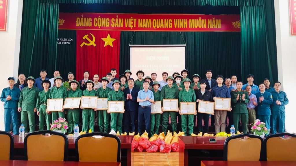 Trong những năm qua, công tác tuyển chọn gọi công dân nhập ngũ luôn được lãnh đạo Đảng ủy, UBND, Hội đồng nghĩa vụ quân sự xã quan tâm. Năm 2024 xã Mai Trung có 22 thanh niên lên đường nhập ngũ( trọng đó tham gia quân đội có 18, tham gia Công an có 04). Tại buổi gặp mặt, các đồng chí lãnh đạo xã đã dặn dò, động viên và gửi gắm niềm tin các thanh niên hoàn thành xuất sắc nhiệm vụ mà đơn vị giao cho, phát huy truyền thống cách mạng của quê hương Mai Trung và phẩm chất bộ đội Cụ Hồ, phấn đấu học tập, rèn luyện trong môi trường quân đội. Các tân bình đã được giao nhận quân trang, quân phục, đồng thời Đảng ủy – HĐND – UBND xã Mai Trung và các ban ngành đoàn thể cũng đã tặng quà cho các tân binh gồm Giấy khen kèm theo phần thưởng 540,000đ cho quân nhân có đơn tình nguyện và mỗi quân nhân được tặng 10kg thịt lơn và 10kg gạo nếp hoa vàng.