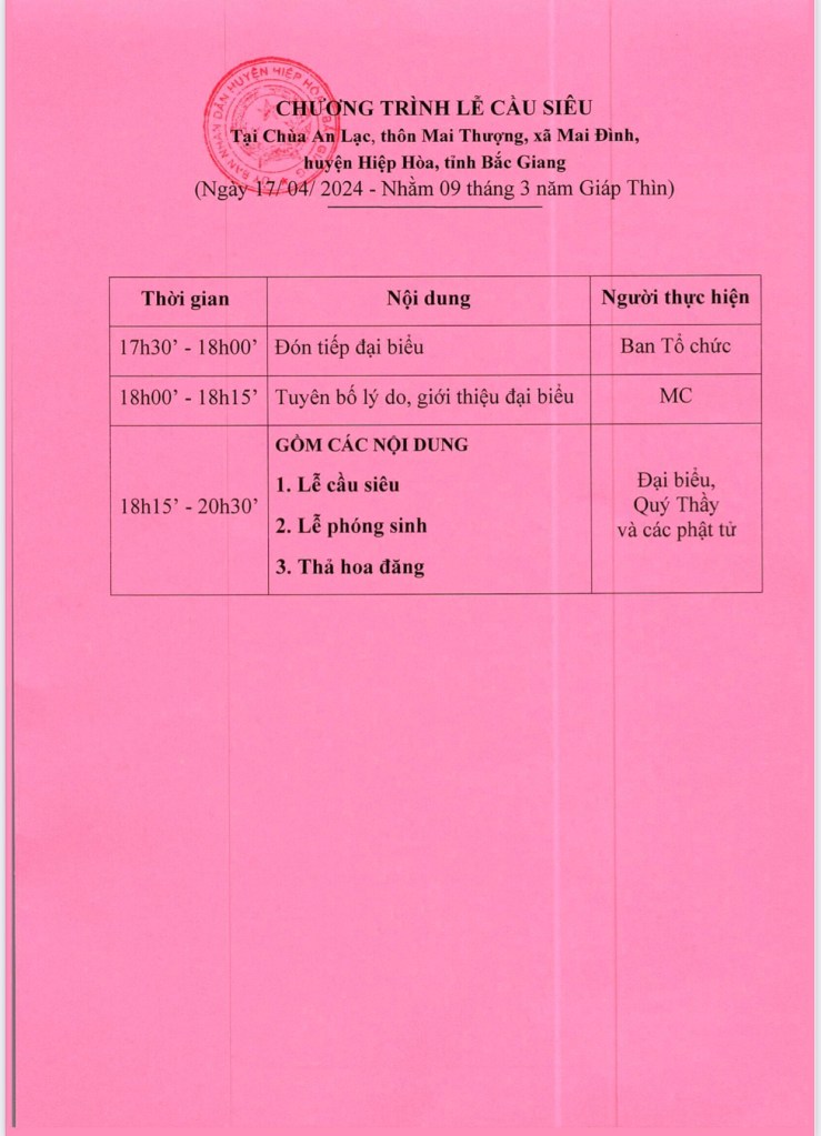 Dưới đây là chương trình cụ thể Lễ cầu siêu