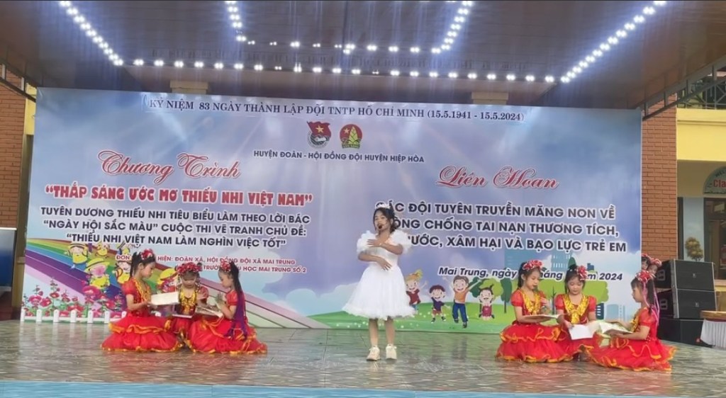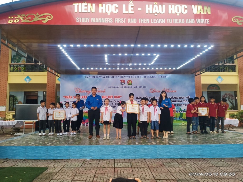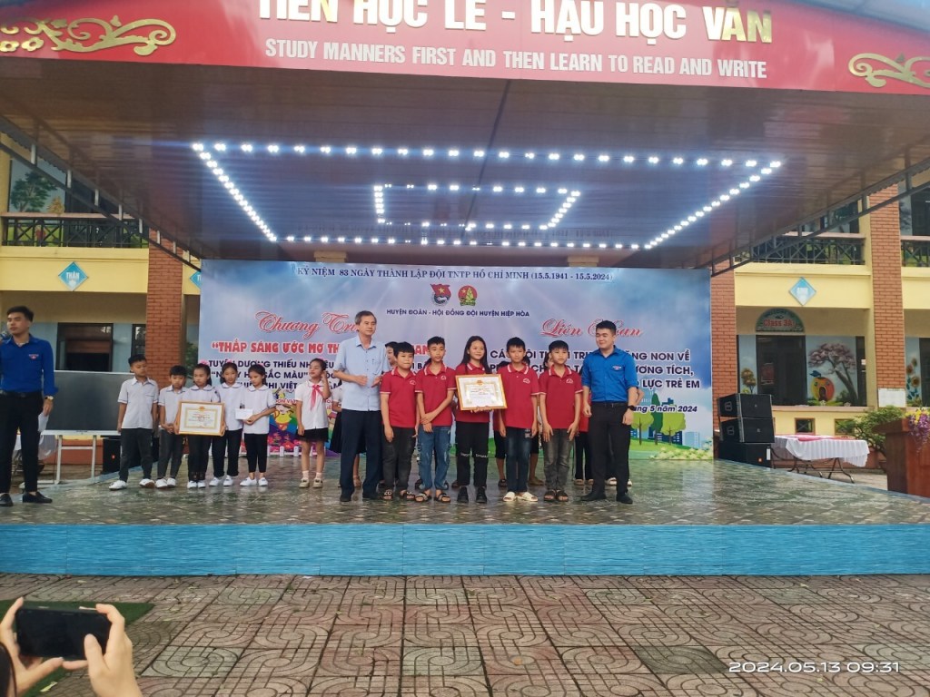Sáng 13/5, Huyện đoàn- Hội đồng đội huyện Hiệp Hòa phối hợp với Phòng Giáo dục và Đào tạo tổ chức chương trình thắp sáng ước mơ việt nam Cuộc thi Vẽ tranh với chủ đề “Thiếu nhi Việt Nam làm nghìn việc tốt”; Liên hoan các đội tuyên truyền măng non về phòng chống tai nạn thương tích, đuối nước, xâm hại và bạo lực trẻ em kỷ niệm 83 năm ngày thành lập Đội TNTP Hồ Chí Minh (15/5/1941 – 15/5/2024) tại trường Tiểu Mai Trung số 2.