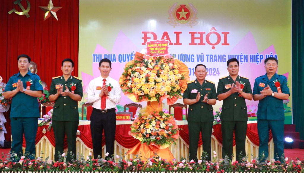 Phát biểu tại Đại hội, Đại tá Vũ Đức Hiền – Chính ủy Bộ Chỉ huy Quân sự tỉnh; đồng chí Dương Thanh Tùng, TUV, Bí thư Huyện ủy, Bí thư Đảng ủy quân sự huyện ghi nhận biểu dương những kết quả với những thành tích nổi bật mà LLVT huyện đạt được trong phong trào “Thi đua Quyết thắng” giai đoạn 2019 – 2024, phong trào đã đi đúng hướng, bồi dưỡng nhân rộng được nhiều đơn vị điển hình xuất sắc, cá nhân tiêu biểu. Phát huy kết quả, thành tích, bài học kinh nghiệm đã đạt được, đồng chí Chính ủy Bộ CHQS tỉnh và đồng chí Bí thư Huyện ủy Hiệp Hòa mong muốn LLVT huyện cần tập trung khắc phục những hạn chế, khuyết điểm, tiếp tục phát triển mạnh mẽ hơn nữa, tăng cường đoàn kết, thống nhất, đẩy mạnh các hoạt động, phong trào thi đua sôi nổi, rộng khắp, góp phần hoàn thành thắng lợi nhiệm vụ quốc phòng – an ninh trên địa bàn. Đồng thời đề nghị, lực lượng vũ trang huyện tiếp tục tham mưu cho cấp ủy, chính quyền thực hiện tốt phong trào thi đua quyết thắng ở địa phương; tuyên truyền phong trào thi đua ái quốc, cuộc vận động thi đua yêu nước và các phong trào thi đua khác; thi đua quyết thắng gắn với việc thực hiện các nhiệm vụ ở cơ sở, thi đua có chủ đề, chỉ tiêu cụ thể; trọng tâm, trọng điểm; xây dựng lực lượng dân quân tự vệ, dự bị động viên vững mạnh, đóng góp thiết thực vào quá trình phát triển của địa phương; phát hiện, bồi dưỡng và nhân rộng các điển hình tiên tiến gắn với cuộc vận động “Phát huy truyền thống, cống hiến tài năng, xứng danh bộ đội Cụ Hồ”.