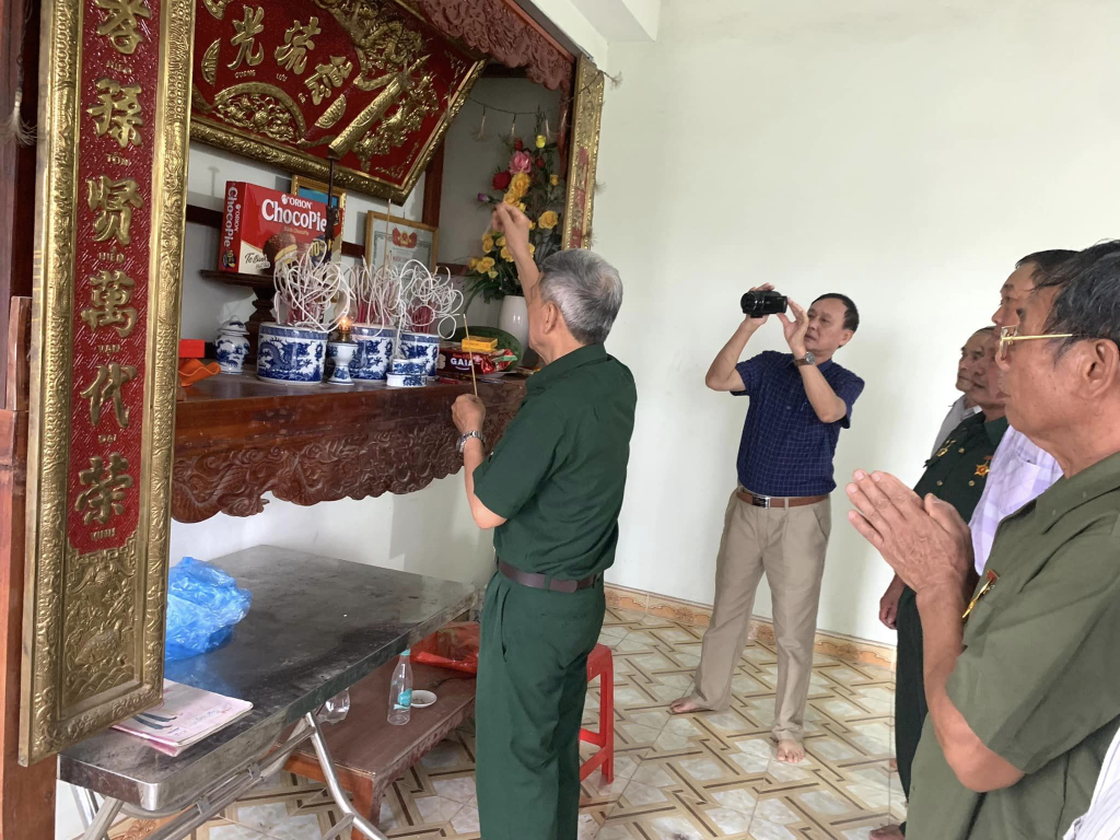 Phó TBT Hương Giang ghi hình làm tư liệu dựng video trong ngày đồng đội về thắp hương cho liệt sỹ Lê Văn Chiến tại quê nhà