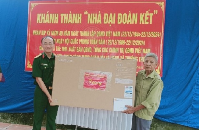 Đại tá Nguyễn Văn Sáu, Bí thư đảng ủy, Phó Giám đốc – Phó Tổng Biên tập Nhà Xuất bản QĐND trao tặng ti vi.