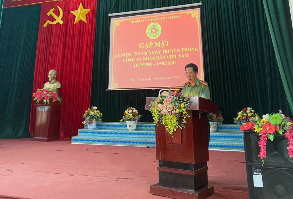 Phát biểu tại hội nghị, thay mặt BTV Hội Cựu CAND huyện, Đại tá Tạ Văn Minh đã trân trọng ghi nhận, biểu dương những thành tích mà Hội Cựu CAND xã Mai Trung đạt được trong thời gian qua. Hội Cựu CAND huyện luôn quan tâm, tôn trọng, ghi nhận, tạo điều kiện và đánh giá cao hoạt động của Hội và mong muốn các hội viên phát huy kết quả đã đạt được, tiếp tục có những đóng góp cho sự nghiệp xây dựng và bảo vệ Tổ quốc, nhất là trong công tác bảo đảm an ninh trật tự trên địa bàn và xây dựng lực lượng Công an trong sạch, vững mạnh.