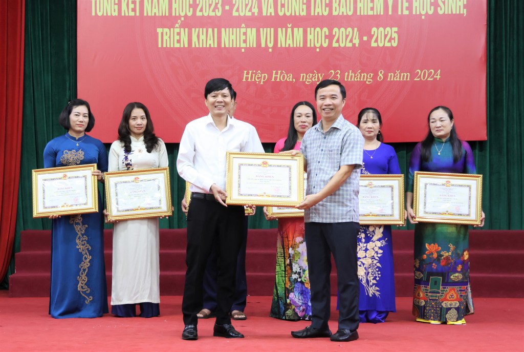 Nhân dịp tổng kết năm học 2023-2024 và triển khai nhiệm vụ năm học mới, huyện Hiệp Hòa có 4 trường học được nhận cờ thi đua của UBND tỉnh; 16 trường học được UBND tỉnh tặng danh hiệu tập thể lao động xuất sắc; 7 tập thể, 18 cá nhân có thành tích hoàn thành xuất sắc nhiệm vụ năm học được Chủ tịch UBND tỉnh tặng Bằng khen.