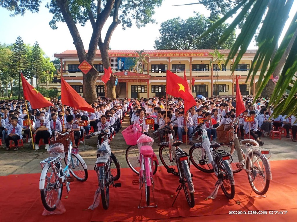 Đón chào năm học mới 2024-2025, nhiều phần học bổng đã được trao cho học sinh khó khăn của nhà trường. Trong đó: Đại diện Công ty Linh Anh tặng 10 suất quà cho học sinh nghèo là 01 chiếc xe đạp/1 suất; Anh Nguyễn Văn Quế tăng bàn ghế cho 01 phòng học và 2 chiếc xe đạp cho các em học sinh và các anh nguyên là học sinh của trường tặng 10 triệu đồng và hàng trăm cuốn vở học sinh. Những suất học bổng được trao sẽ là nguồn động viên, khích lệ các em vượt qua khó khăn, vững bước đến trường.