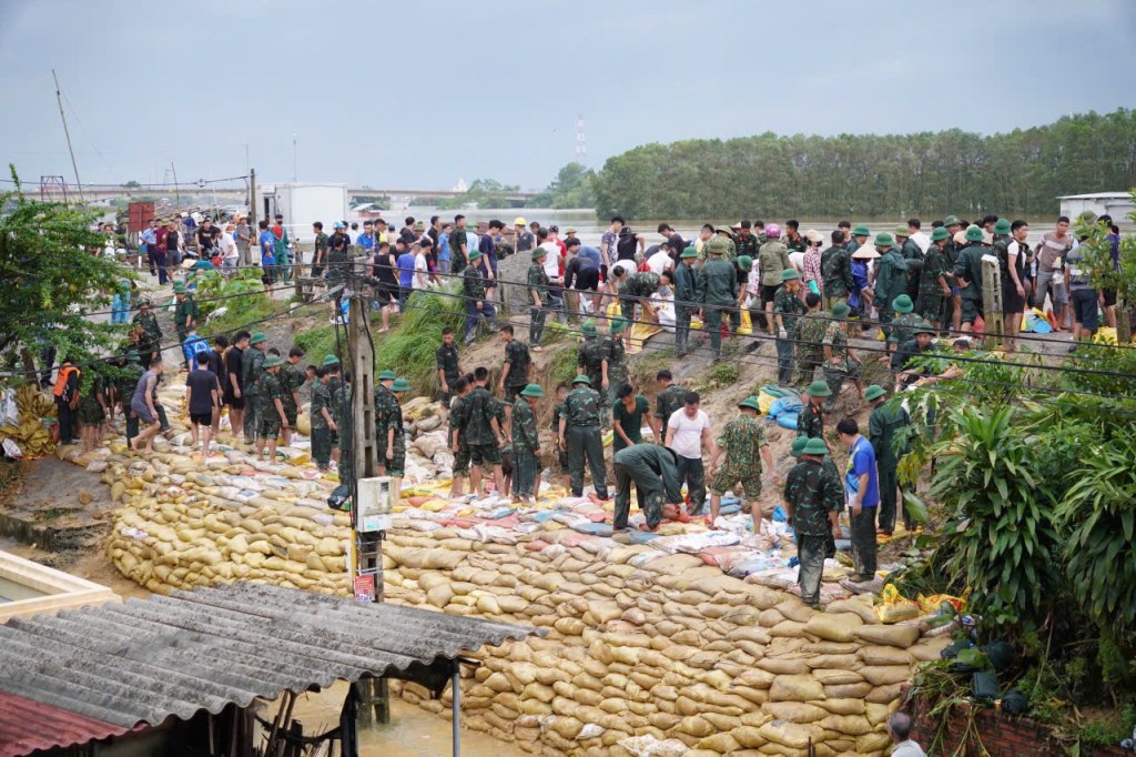 Các cán bộ chiến sỹ quân đội phối hợp cùng các lực lượng tham gia đắp đê chống tràn, ngăn lũ, gia cố đảm bảo an toàn đê Tả Cầu