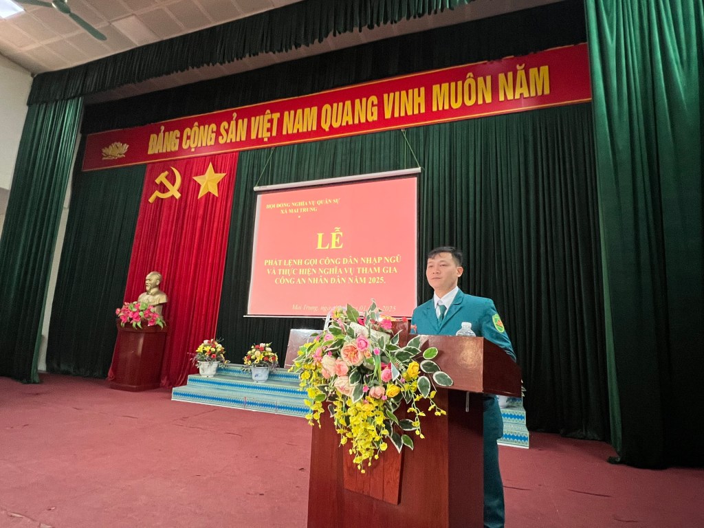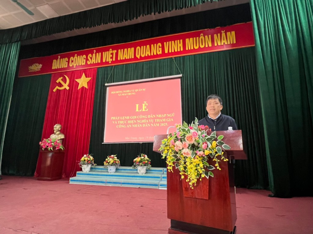 Sáng 19/01, Hội đồng nghĩa vụ quân sự xã Mai Trung đã tổ chức trao lệnh gọi công dân nhập ngũ năm 2025 cho 23 thanh niên trúng tuyển nghĩa vụ quân sự. Dự hội nghị có Trung tá Đào Quang An, Phó Tham mưu trưởng Ban CHQS huyện; lãnh đạo Đảng ủy, HĐND, UBND xã.