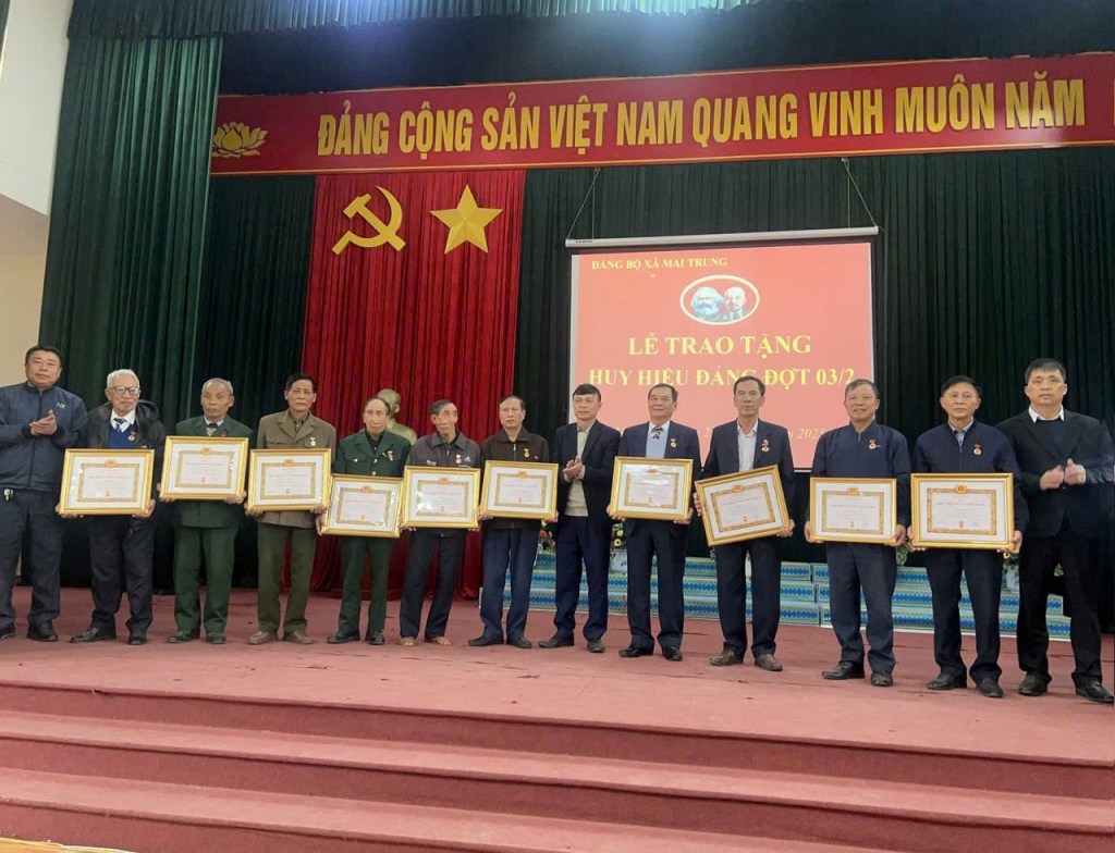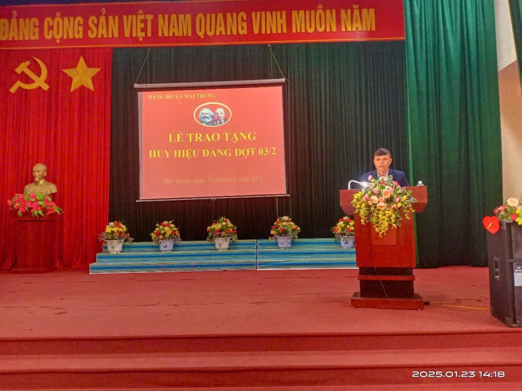 Nhân dịp kỷ niệm 95 năm Ngày thành lập Đảng (3/2/1930 – 3/2/2025), ngày 23/01, Đảng ủy xã Mai Trung tổ chức lễ trao Huy hiệu Đảng đợt 3/2 cho 14 đồng chí đảng viên thuộc Đảng bộ. Tham dự có đồng chí Ngô Văn Quyết, Phó Bí thư thường trực Đảng ủy; đồng chí Ngô Văn Phương, Phó bí thư, Chủ tịch UBND xã cùng các đồng chí Đảng ủy viên, Bí thư các chi bộ, trưởng các thôn cùng 14 đảng viên được nhận Huy hiệu đợt này.