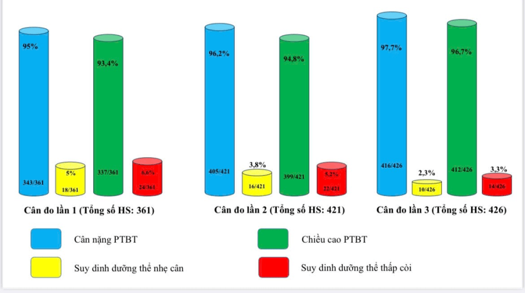 Công tác thực hiện cân, đo trẻ được giáo viên quan tâm sát sao. Ngay từ đầu năm học giáo viên đã thực hiện cận đo đầu vào để nắm được tình trạng sức khỏe của trẻ ở từng nhóm, lớp. Từ đó nhà trường đã xây dựng thực đơn, tính khẩu phần ăn phù hợp theo mùa, nhằm kích thích được tất cả trẻ ở các độ tuổi đều có mong muốn trẻ được ăn ngon, ăn hết xuất…Do đó đã khắc phục được tình trạng trẻ bị suy dinh dưỡng ở 2 thể nhẹ cân và thể thấp còi rõ rệt ở lần cân, đo thứ 3 so với lần thứ 2 và lần đầu.