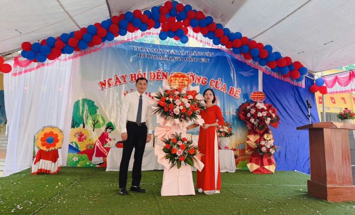 Đồng chí Nguyễn Ngọc Phương- Ủy viên Ban Thường vụ Đảng ủy, Phó Chủ tịch UBND xã Hoàng Vân tặng hoa chúc mừng cô trò Trường Mầm non Đồng Tân