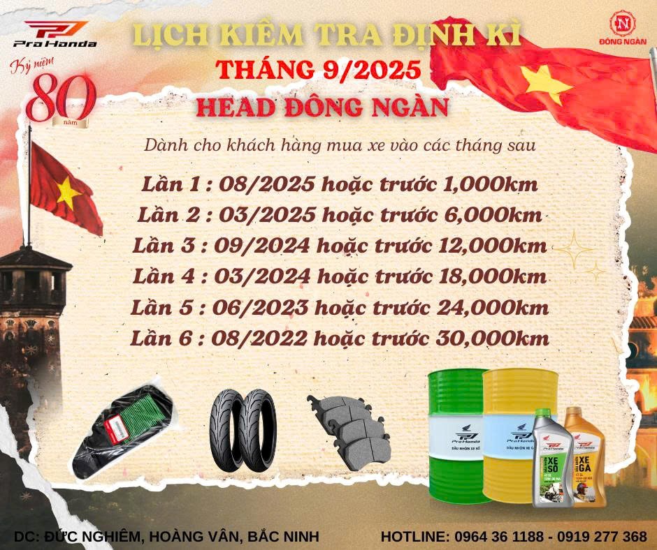 II. Đối với khách hàng đến làm dịch vụ tại Head Đông Ngàn ⁎Khi khách có lịch kiểm tra định kỳ từ lần 1 đến lần 6 được giảm 50% tiền dầu. ⁎Khi khách có sinh nhật trong tháng nằm trong danh sách được cửa hàng gọi điện sẽ được miễn phí tiền dầu ⁎ Khi làm bảo dưỡng toàn bộ 250.000đ sẽ được tặng: 1 chai dầu máy, 1 bugi, 1 chai nướclàm mát, 1 chai dầu giảm sóc và rửa xe miễn phí khi được cửa hàng gọi đến làm dịch vụ hoặc khách hàng mua xe mới được tặng phiếu.-Với khách hàng đến làm dịch vụ có hoá đơn trên 1.000.000đ áp dụng cho tất cả phụ tùng thay thế sẽ được tặng 1 voucher thay dầu miễn phí hoặc 1 mũ bảo hiểm nửa đầu.