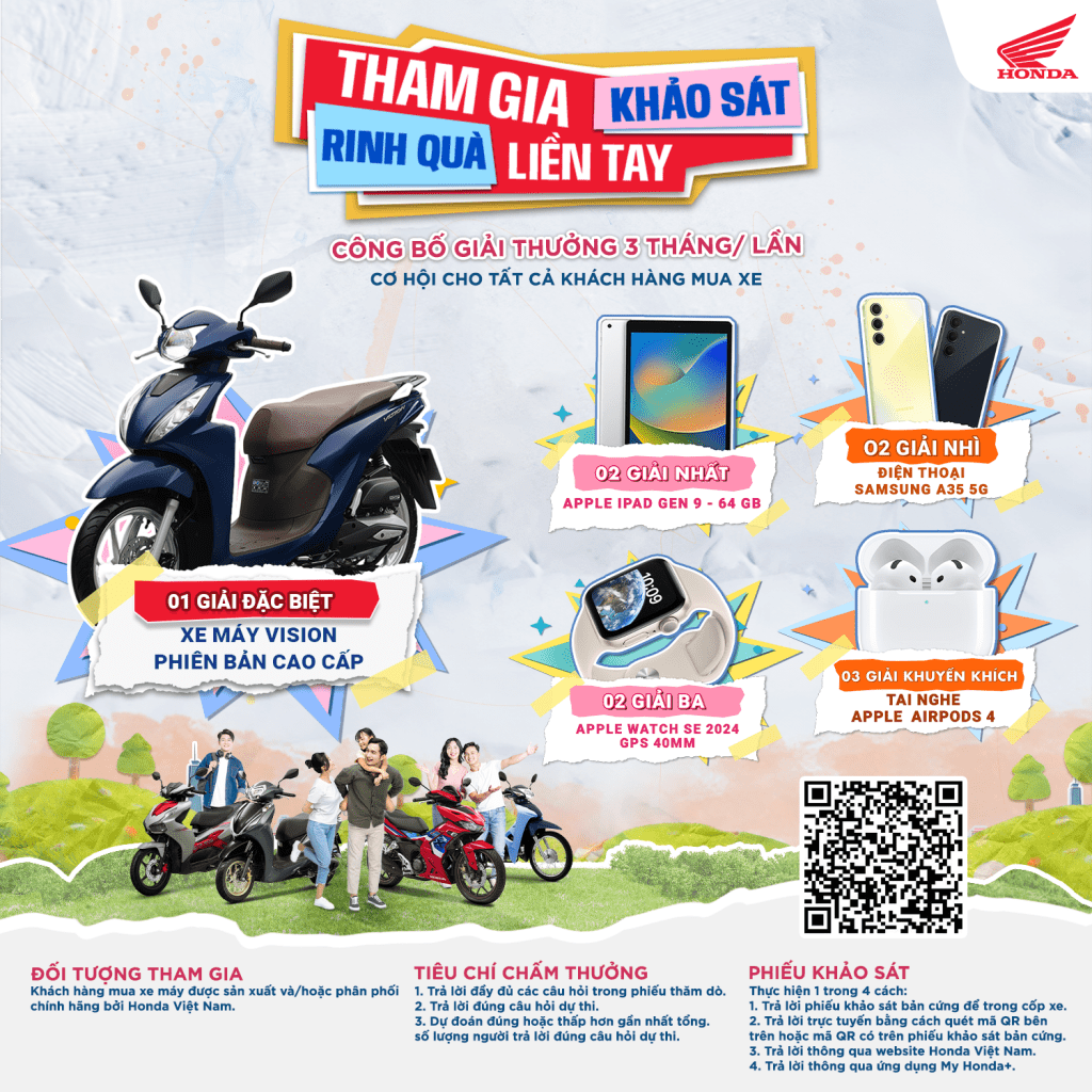 3. Hình thức tham gia: – Trả lời phiếu thăm dò bản giấy: khách hàng gửi phiếu qua hòm thư bưu điện về HVN – – – Trả lời trực tuyến bằng cách quét mã QR trên phiếu thăm dò bản giấy hoặc trên các vật liệu quảng cáo Trả lời thông qua website Honda Việt Nam Trả lời trên ứng dụng điện thoại My Honda+ Lưu ý: Mỗi khách hàng chỉ tham dự chương trình qua 01 phương thức duy nhất. Trường hợp khách hàng tham dự chương trình bằng nhiều phương thức, phiếu dự thi cuối cùng HVN nhận được sẽ được tính là phiếu dự thi hợp lệ duy nhất của khách hàng. Khách hàng không phải trả bất kỳ khoản phí nào khi tham dự chương trình. 4. Cơ cấu giải thưởng (dành cho mỗi đợt trao thưởng) ❖ 01 giải đặc biệt: Xe máy Vision phiên bản Cao cấp trị giá 32.979.273đ ❖ 02 giải nhất: Apple Ipad Gen 9 – 64GB, mỗi giải trị giá 9.850.140đ ❖ 02 giải nhì: Điện thoại Samsung A35 5G, mỗi giải trị giá 8.758.800đ ❖ 02 giải ba: Apple Watch SE 2024 GPS 40mm, mỗi giải trị giá 7.074.000đ ❖ 03 giải khuyến khích: Tai nghe Apple Airpods 4, mỗi giải trị giá 4.996.080đ (Giá trị giải thưởng đã bao gồm thuế GTGT) Tổng giá trị giải thưởng cho mỗi đợt trao thưởng: 99.333.393đ