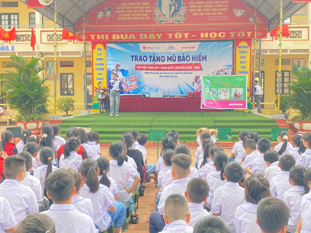 Thực hiện chương trình phối hợp giữa Honda Việt Nam với Bộ Giáo dục đào tạo và Uỷ ban ATGT Quốc gia về việc tặng mũ bảo hiểm cho học sinh lớp 1 vào đầu năm học mới, sáng nay 20/10 tại trường Tiểu học Ngọc Sơn xã Hoảng Vân tỉnh Bắc Ninh , HEAD Honda Đông Ngàn đã tổ chức chương trình tặng mũ bảo hiểm cho toàn bộ học sinh lớp 1 trong trường. Tham dự chương trình có đông đủ các thầy cô giáo và các em học sinh của trường.