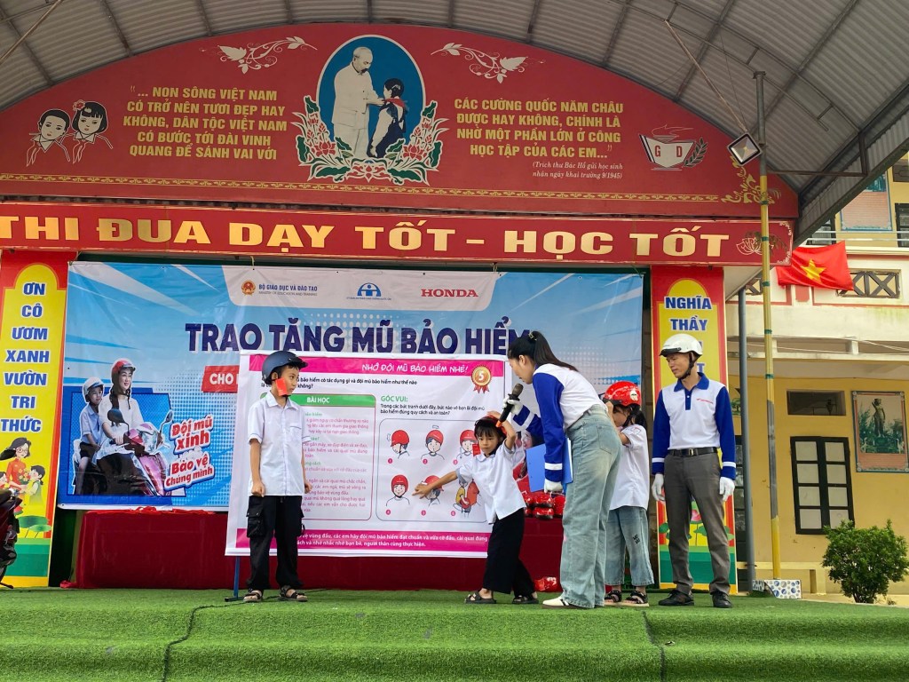 Về phía Honda Đông Ngàn có ông Nguyễn Văn Hiển- cửa hàng trưởng và một số nhân viên kỹ thuật của cửa hàng. Mở đầu chương trình, HDV của HEAD đã trình bày thực trạng của vấn đề An toàn giao thông hiện nay trên phạm vi toàn quốc cũng như trong địa bàn tỉnh Bắc Ninh. Cụ thể, trong 9 tháng đã qua của năm 2025 tình trạng tai nạn giao thông trên cả nước tuy đã giảm cả về số vụ , số người chết và bị thương nhưng vẫn còn ở mức cao, đáng báo động. Nguyên nhân gây ra tai nạn thì có nhiều , cả khách quan và chủ quan. Nhưng nhiều nhất vẫn là yếu tố chủ quan của người tham gia giao thông như phóng nhanh , vượt ẩu, không tuân thủ các quy tắc giao thông , không đội mũ bảo hiểm …Vì thế, tai nạn giao thông vẫn xảy ra thường xuyên, nhất là giao thông đường bộ. Điều đó đã trở thành một vấn nạn nhức nhối, ảnh hưởng nghiêm trọng đến đời sống xã hội. Chính vì vậy, vấn đề ATGT đã và đang được chính phủ và mọi cấp, mọi ngành quan tâm đặc biệt, nhằm tiến tới xây dựng một xã hội giao thông văn minh – an toàn , góp phần mang lại hạnh phúc cho toàn dân. Đồng thời trong chương trình này, BTC còn kết hợp phổ biến những kiến thức cơ bản về luật giao thông đường bộ, hướng dẫn học sinh nhận biết các bảng biểu giao thông cũng như các quy tắc tham gia giao thông an toàn. Đồng thời, các HDV cũng đã hướng dẫn tỉ mỉ cho các cháu học sinh cách ngồi sau xe máy và phương pháp đội mũ bảo hiểm đúng cách khi tham gia giao thông .