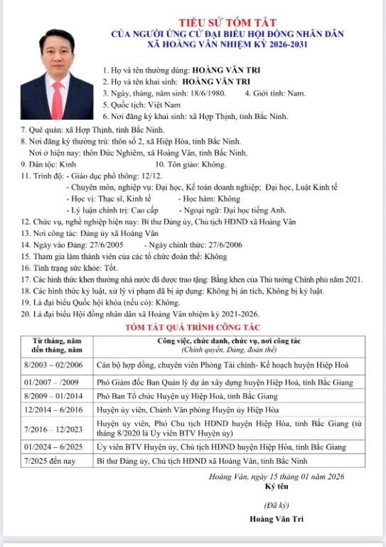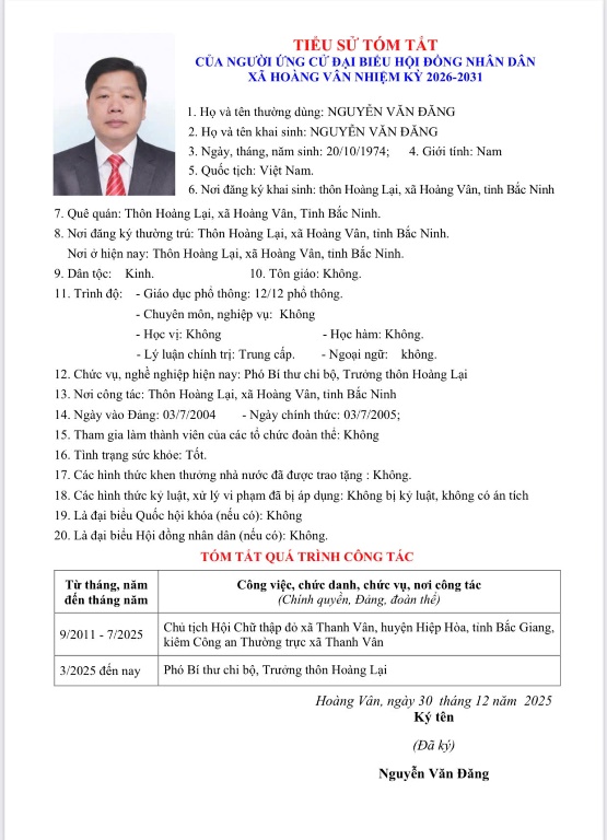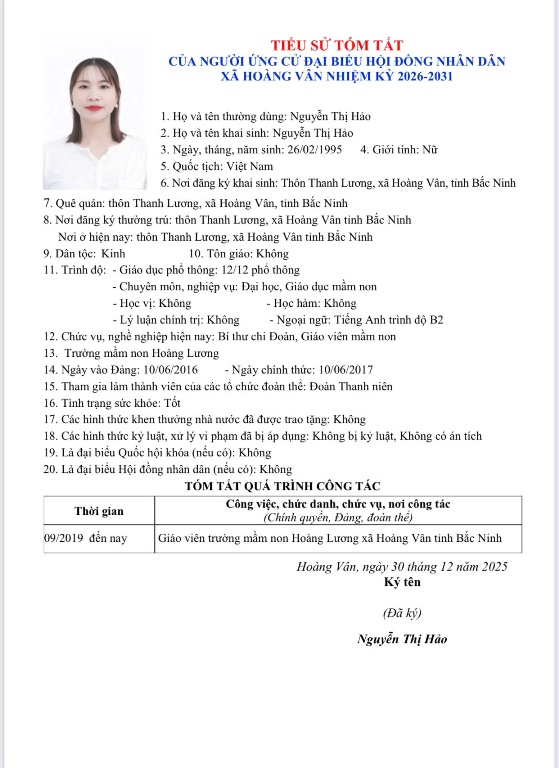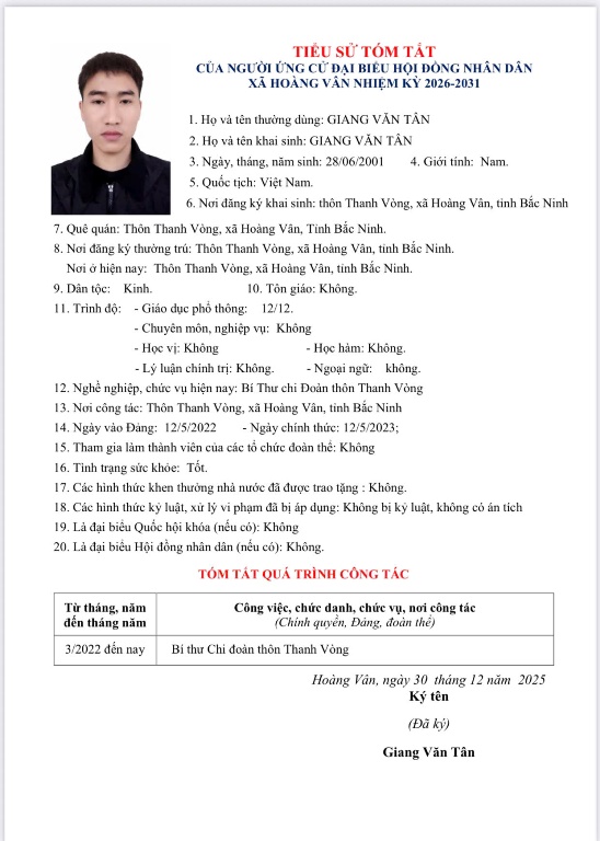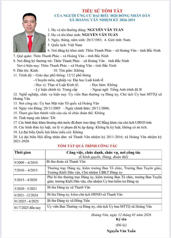Ban biên tập Trang thông tin điện tử xã Hoàng Vân trân trọng giới thiệu tiểu sử tóm tắt của 42 Ứng cử viên Đại biểu HĐND xã Hoàng Vân, để bầu ra 25 đại biểu.