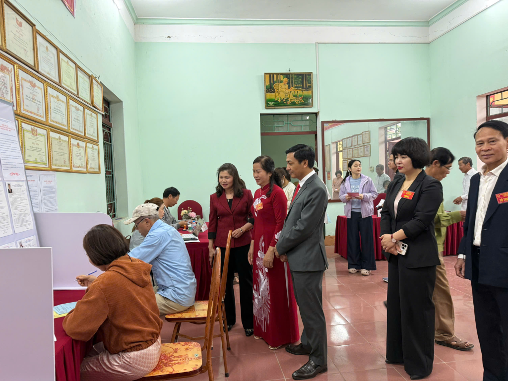 Đồng chí Lâm Thị Hương Thành cùng lãnh đạo xã thăm khu vực bỏ phiếu thôn Tiên Hưng