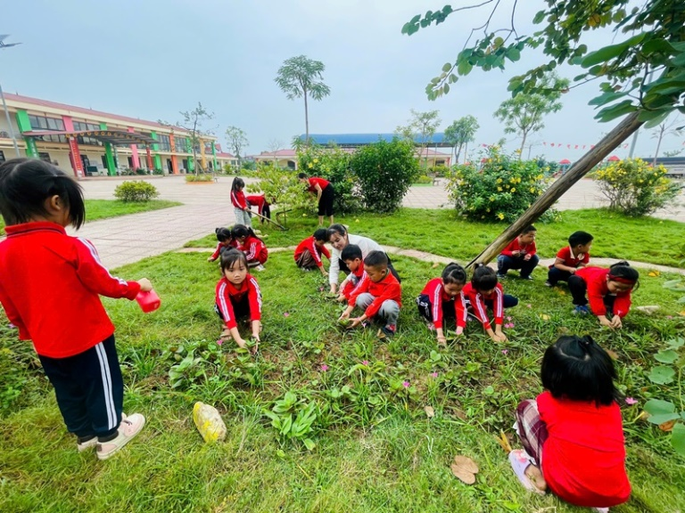 Trong hoạt động ngoài trời: Trẻ được trực tiếp tham gia các công việc vừa sức như tưới nước, nhổ cỏ, phụ cô cho gà ăn. Qua đó, các bé học được cách quan sát, hình thành ý thức bảo vệ môi trường, tình yêu thiên nhiên và phát triển thẩm mỹ.